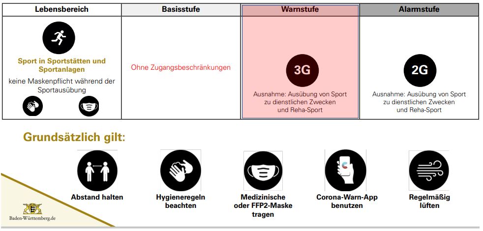 Auf Grund des Eintrittes in die Warnstufe gilt ab dem 23.02.2022 gemäß der Verordnung in Baden-Württemberg die 3G Regelung für Sport in geschlossenen Räumen.