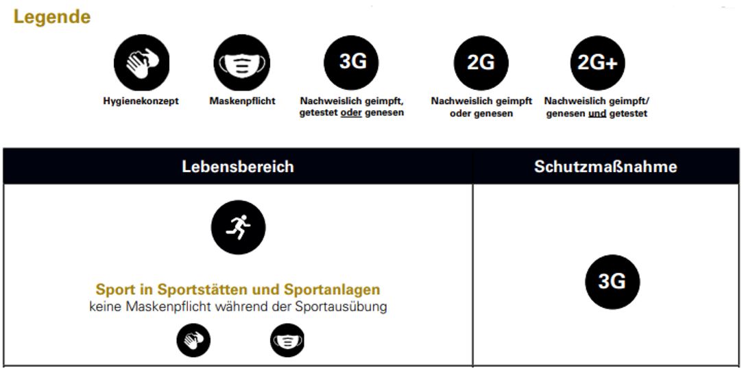 Nach Aufhebung des bisherigen Stufensystems (Basis, Alarm- und Warnstufe gilt ab dem 19.03.2022 gemäß der Verordnung in Baden-Württemberg die 3G Regelung für Sport in geschlossenen Räumen.