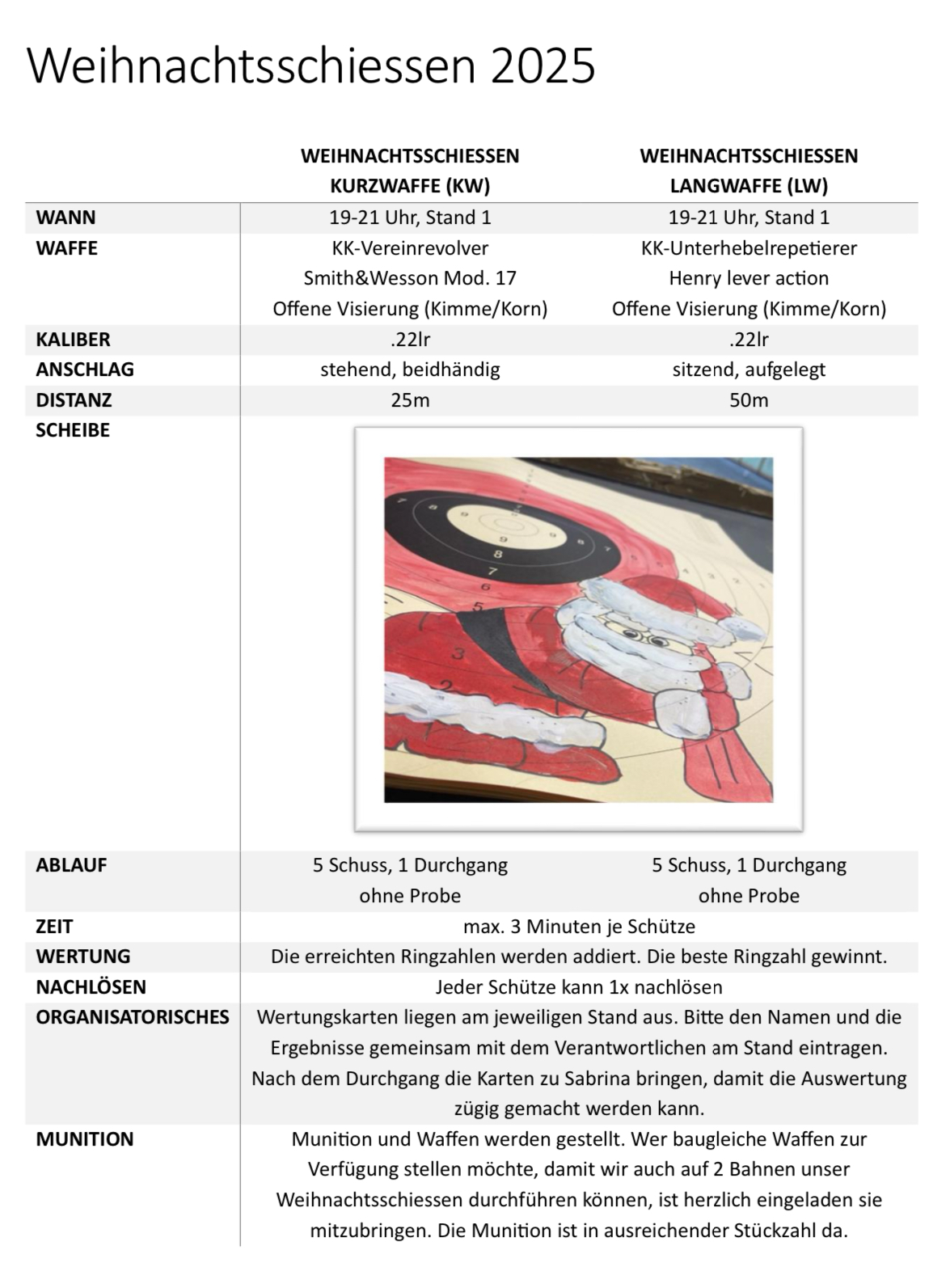 Weihnachtsschiessen LW (Nikolausscheibe) statt. Alle anderen Stände sind wie gewohnt von 20 bis