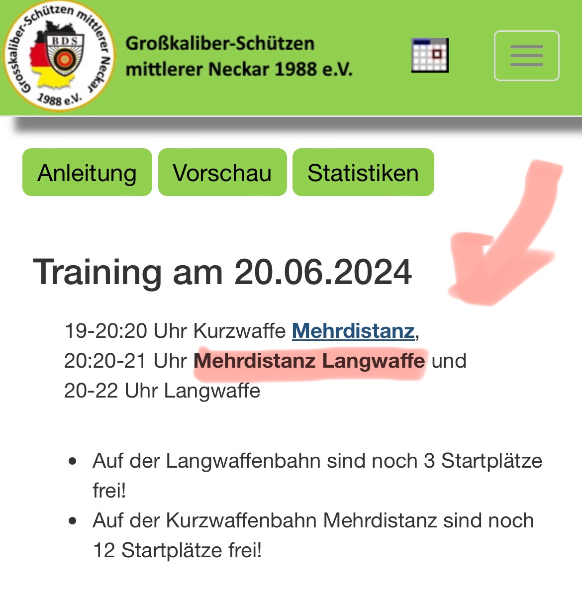 Die Standbelegung für die Trainingstermine und die Vereinsmeisterschaft erfolgt NICHT über unsere Homepage, sondern per Email an Markus Maimer m.maimer@gmx.de. Bei der Anmeldung bitte aufführen, wie viele Starts in der jeweiligen Kategorie (KK, GK, Flinte) pro Teilnehmer geschossen werden. z.B. Max Mustermann 2x KK, 3x GK, 2x Flinte. Allgemeine Hinweise und Sicherheitsbestimmungen: Es gelten die Bestimmungen des aktuellen BDS Sporthandbuchs. Außerdem gelten die Vorgaben der Verordnung zum Waffengesetz, insbesondere in Bezug auf die vom Schießsport ausgeschlossenen Waffen (§ 6 AWaffV). Bei kritischen Waffen hat der Schütze den Nachweis der Freigabe für Sportschützen selbst zu erbringen. |